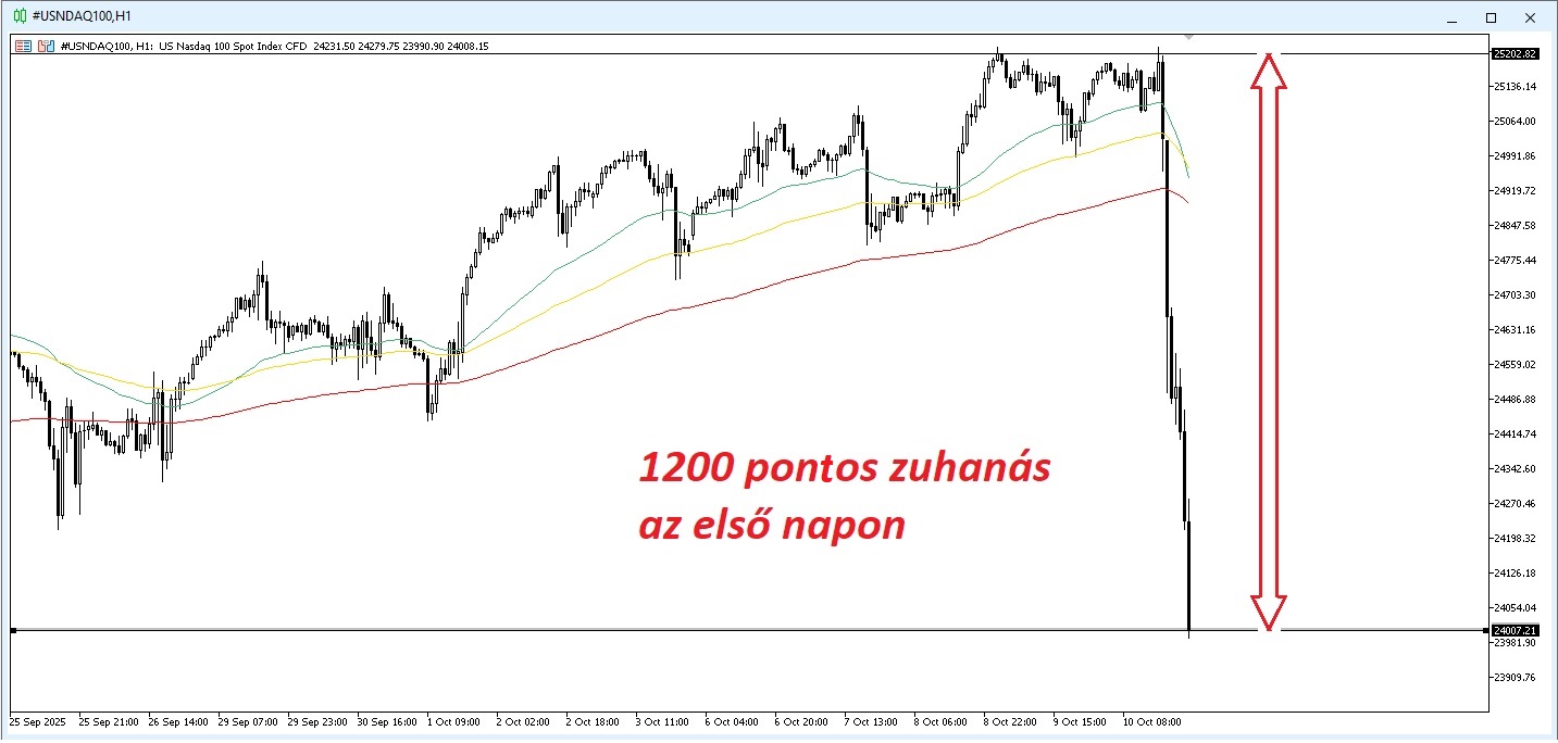 Piaci sokk, miután Donald Trump elnök pénteken bejelentette, hogy az Egyesült Államok november 1-jétől új, 100%-os vámot vet ki a Kínából érkező importra „a jelenleg fizetett vámon felül”.